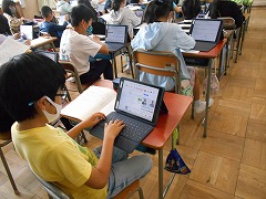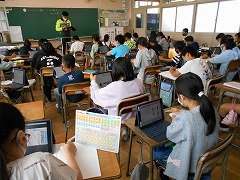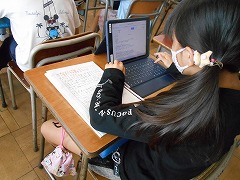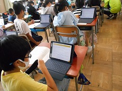 社会科の授業で、それぞれの課題を自分のペースで自由にサイトにアクセスして調べていました。印象に残ったのは、タブレットを使っていると、児童はすごく集中し、とても静かに学習していたことです。ただし、気をつけなけらばいけないことは、本当に調べたいことではなく、たまたま見つけたサイトの内容をコピペ(コピー&ペースト)しがちです。目的をもって調べ、知りたい内容の書かれた資料を見つける力が必要かなと感じました。