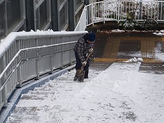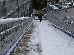 雪の朝は大変です。職員が自主的に朝7時前から出勤し、校内や通学路で危険な場所を見つけては、除雪作業を行います。今日は歩道橋がしっかりと凍っていて、大変滑りやすい状態でした。表面の雪をどけ、氷を砕いて滑りにくくする作業をしましたが、氷が硬く、砕くのが大変でした。児童等は手すりをしっかりとつかみ、気をつけて渡りましたが、何人かは転んでしまいました。怪我をしなかったのが幸いでした。今回の雪は、土日がピークで、雪遊びをするほど雪が残っておらず、全員で楽しむ雪でなかったのが残念でしたね。