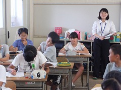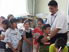 その後は、今行われているラグビーワールドカップに振れながら、アイルランド戦の歴史的大勝利から感じたことを話しました。勝因に挙げられている「ワンチーム」という言葉を紹介し、みんなが自分の役割を自覚して、その責任を果たしながら、チームが一つになると個人のパワーでは負けていても、集団の力では上回ることができるということを話しました。そして、ラグビーは最後にトライを決めた人だけの力ではなく、そこまでボールをつないだ人やそのために犠牲になってぶつかっていった人たちの集大成がトライであることを話しました。トライをした福岡選手の「ぼくは最後に置いただけ」という言葉からラグビーのよさであるチーム一丸を感じてほしかったです。ただ、小学生にはラグビーはちょっと難しいのか、思ったより関心が低いようでちょっと残念でした。