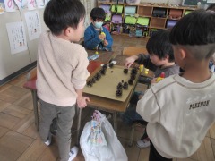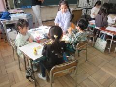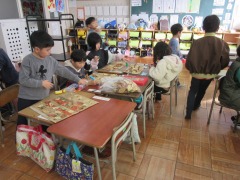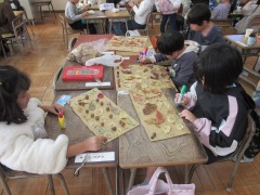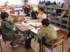 1年生の教室は、みんなで集めたどんぐりやまつぼっくりでおもちゃ作りに一生懸命です。作りたいおもちゃへの思いが人それぞれですが、話し合いながら折り合いをつけておもちゃづくりを進めています。途中、遊びたくなってしまったり、意見の食い違いがおこったりすることもありますが、協力して頑張ろうとする姿が微笑ましいです。