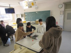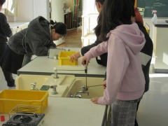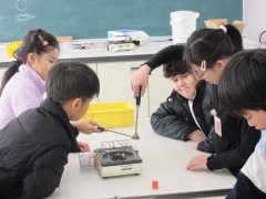 理科室では、4年生が「金属が温められたり冷やされたりすると、体積は変わるのか」を確かめていました。金属の球をお湯で温めたり炎で熱してみたり、水で冷やしてみたり。グループで役割分担をし、協力して安全に実験を進めていました。「冬場に鉄道のレールにすき間があること」につながったようです。