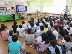 4年生で、2回目の環境出前授業がありました。今回は、お買い物で良く訪れるスーパーの環境への取組や、リサイクルについてお話を聞きました。