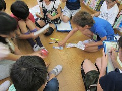 牛乳パックや使い終わった油からリサイクルされた商品や、自然由来の成分でできたパックなどを実際に見せていただいたり、エコマークがどんなものについているかをグループで探す学習もさせていただきました。さらに授業の終わりには、木を切ったおがくずをリサイクルさせた粘土を使って、えんぴつ作りにも挑戦しました。