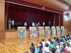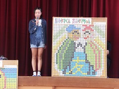 本日朝礼時に、台風21号のため先週から延期されていた本年度のエコキャップアートの披露式が行われました。