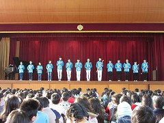 朝礼や児童集会で、児童会役員に続いて全校児童が、声に出して確認をしています。この宣言は、平成22年度前期児童会役員が作成しました。各学級や昇降口に掲示しています。