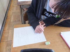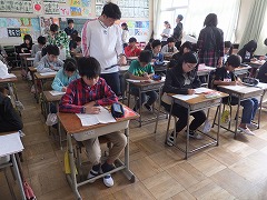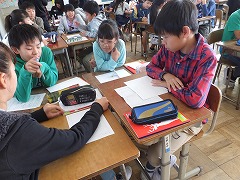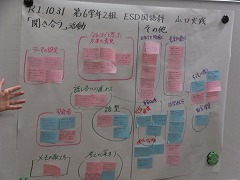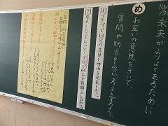 今日の学習は「未来がよりよくあるために」という単元でした。友達の意見も聞いて、調べたことを生かしながら説得力のある意見文を書くことがめあてです。その中で今日の学習は友達の忠告や質問を聞いて、自分の考えを深めることがねらいでした。45分の授業の中で、30分程度が、グループでの意見交換の時間でした。新しいことに意欲的に挑戦する先生の姿勢をうれしく思いました。ただし、班での活動は、授業時間内にすべての子の活動を教師が把握することはできないという課題もあります。そして、児童に多くの時間を任せることになるので、活動までの意識付け・意欲付けが重要となってきます。それらを今後どう克服していくか、午後から行われる事後研究会での話し合いがとても楽しみです。