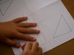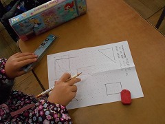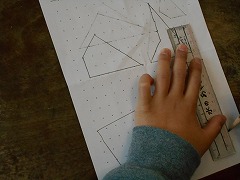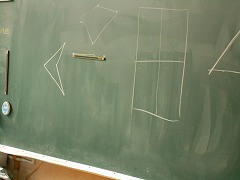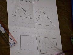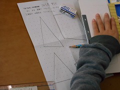2時間目に2年生が算数の学習をしていました。課題は、点がたくさんかかれたプリントに、「いろいろな三角形や四角形をかきなさい」というものでした。三角形なら適当に点を三つとってそれを直線で結べばよいのですが、見ていると直角三角形を描いている子がとても多かったです。次に二等辺三角形。なんでもない三角形や鈍角の三角形を描いている子はほとんどいません。四角形も同じです。正方形や長方形。せいぜいひし形や平行四辺形ぐらいです。担任の先生が黒板に180度以上の角を含む四角形を例示されていましたが、なかなかピンとこないようでした。