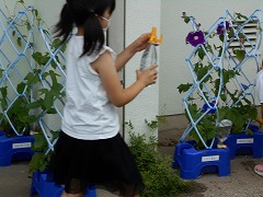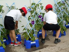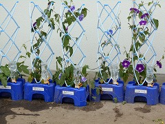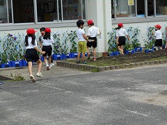 今、1年生はあさがお、2年生はミニトマト、3年生はホウセンカを個人で育てています。梅雨ですが、雨のない日もあり、十分な水やりが必要になってきます。今日も早速、多くの1年生があさがおに水をあげていました。1年生の教室前には、もう花を咲かせたあさがおもたくさん並んでいます。