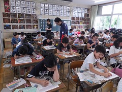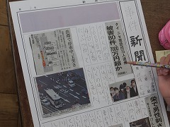 3・4時間目に5年生の各教室で、新聞についての出前授業が行われました。講師は昨年度のPTA会長武田様をはじめ新聞販売店の6名の方です。3クラスに2人ずつ分かれて行っていただきました。3時間目は、日頃、何気なく見ている新聞の「題名」に隠された秘密や新聞のできるまで、そしてインターネットの情報と新聞の情報との違いなどを多くの映像資料をもとにわかりやすく説明していただきました。4時間目は学んだことを生かして、それぞれが興味のある記事を集めた、オリジナル新聞づくりに挑戦しました。実際に体験してみると、見出しをつけるのにも工夫や苦労があることがよくわかりました。これからは、このホームページの見出しも少し工夫を加えたいと思います。