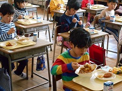 新1年生にとっては、今日が初めての給食でした。メニューは定番のカレーライス。準備が比較的簡単で、みんなが大好きなカレーが必ず最初の献立で選ばれます。