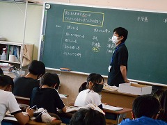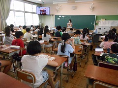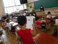 1年生は、夏休みの思い出の発表会を楽しそうにしていました。2年生は、秋の虫の歌の学習です。歌を歌いながら季節を感じていました。3年生は、英語の学習。元気に発音していました。4年生は、図工室でカラフルな色画用紙で作品作りに熱中していました。5年生では、清掃担当替えを行っていました。野外活動が終わって、やっと新学期という感じです。6年生は、歴史の学習で武士が力をもってきた頃を学んでいました。もうすぐ鎌倉時代です。なんとか修学旅行までに奈良時代・平安時代の学習は終わりそうです。