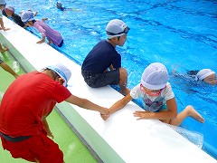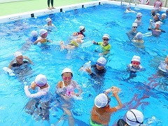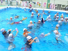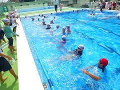 7月12日(火) 着衣水泳がありました。3年生は1・2時限、4年生は3・4時限のプールの授業時間内に実施しました。実際に衣服を着用したことで、沈みやすくなることや泳ぎにくくなることを体で感じ、一人一人が危機感をもって活動することができました。水の中で体をうまく浮かせるにはどうしたらよいかを考え、ペットボトルの持ち方や体の向きなどを工夫し実践している様子が見られました。