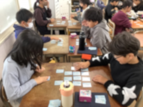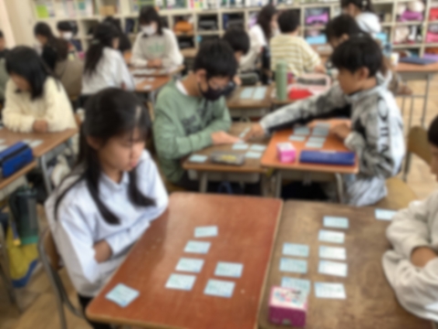 6年生の書写の時間では『用紙に合った文字の大きさと配列』の単元で、百人一首の中の一首を選んで、次回から小筆を使って書きます。百人一首をしながら、自分の書きたい一首を選んでいました。