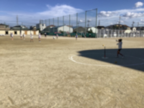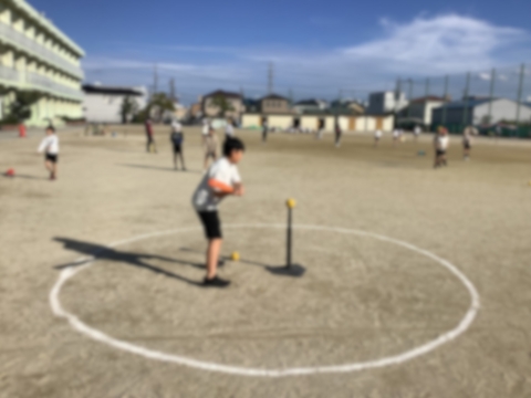 5年生の体育ではベースボール型の球技をしています。バットでボールを打つ練習を何度もし、遠くにボールを飛ばす子が多くなってきました。