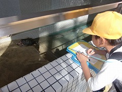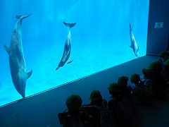 前半は、2年生全員で見学をしました。イルカが泳ぐ大水槽を前に、子どもたちは大興奮!目の前を上下左右に動き回るイルカを見て、さっそくしおりに気付いたことをまとめました。次はイルカショーです。先ほどのイルカたちが、水の中から大ジャンプしたり、輪くぐりをしたりするのを見て、思わず拍手が出ました。大興奮のまま、あっという間にショーは終わってしまいました。
