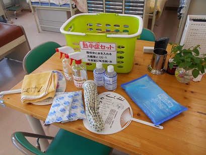 写真は保健室に準備してある、熱中症対策グッズ(体を冷やすための、氷・うちわ・霧吹き(体にかけて冷やします)、水分を補給する経口補水液)です。