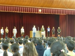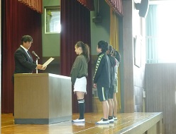 今朝は、後期始まり式があり、校長先生からは月目標・週目標と関連して「その場にあった言葉をつかいましょう」というお話がありました。また、後期児童会役員認証、引き継ぎ式が行われ、前期の児童会会長から後期の役員に向けて応援の声がありました。