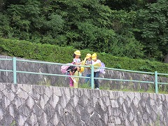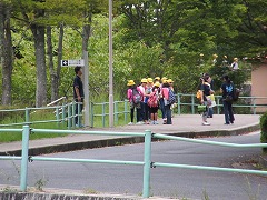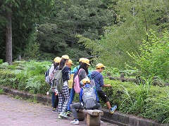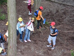 次は、旭高原少年自然の家の散策を行いました。しおりの中にある自然ビンゴの表をもとに、『細い木』や『とんぼ』などを探します。行動範囲が決まっているので、まずは近場で探し始めました。やがて、「この木って、細いかなあ?」「太いんじゃねえ?」や、「先生、卵ってどこにありますか?」などと、班で相談したり先生に聞いたりし始めました。