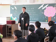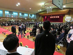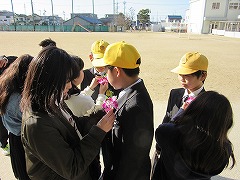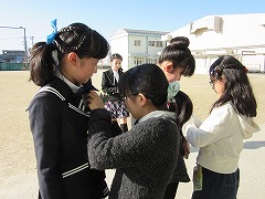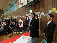 8時過ぎには、式用の服に身を包んだ6年生がにこやかに登校してきました。昇降口では、少し前に来て準備をしていた5年生から、胸に花をつけてもらいました。