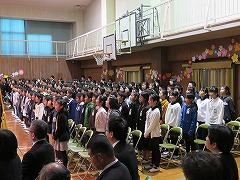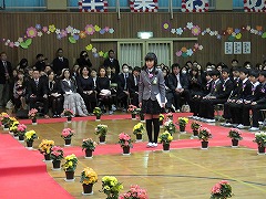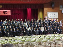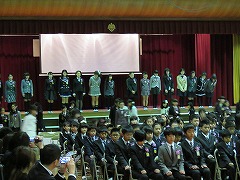 門出の言葉です。6年生は舞台側に移動して、これまでの6年間を振り返るとともに、感謝の気持ちや未来への希望を語りました。また、6年生のみんなで行う最後の合唱を行いました。