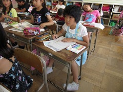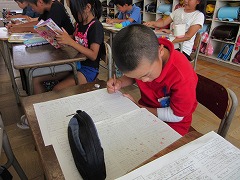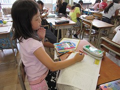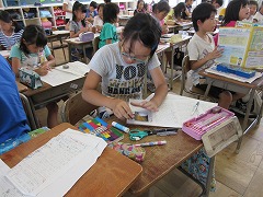 壁新聞の形で、新聞タイトル、見出しを工夫しながら3つの記事を書きます。すでに下書きができあがった子が多く、文については担任の先生に直してもらったものを見て清書するだけです。清書に当たり、「タイトルや見出しは、色をつけたり、ペンや色鉛筆で文字を塗りつぶしたりしていいですよ。」と説明を受け、目立たせる工夫を取り入れながら作成を目指しました。2時間後、2/3の子たちは無事完成しました。残った子たちはもう一息です。