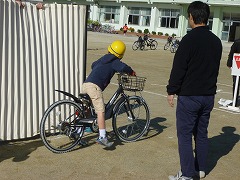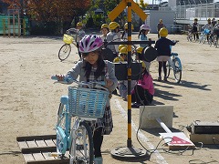運動場では、3年生と5年生がワンポイント安全走行ということで、踏切の横断、見通しの悪い交差点の通過、信号交差点の通過、障害物がある場合の走行を行いました。運動場の簡易コースでしたが、安全な運転を意識した実習になりました。「危ない、赤信号だった・・・。」と練習であっても実際の道路を想定した子がたくさん見られました。6年生は、南小の西~南の公道を使った実習をしました。本年度も、保護者のみなさんがボランティアとしてたくさん参加していただきました。交差点に立っている大人から声をかけてもらうことで、6年生は普段気づかない自分の運転の癖について知ることができたようです。ご協力ありがとうございました。