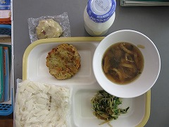 30日の給食は、五目きしめん、牛乳、あかもく(海藻)と野菜のかき揚げ、水菜おひたし、鬼まんじゅうでした。