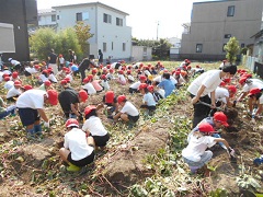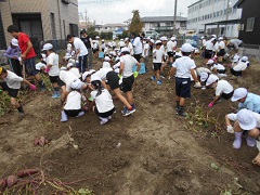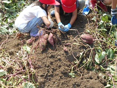 今日はとても暑い日でしたが、子どもたちはスコップや軍手をした手で一生懸命に芋を掘っていました。今年は、例年よりも大きな芋が取れたようでようです。子どもたちもたくさん芋が取れてとても嬉しそうでした。