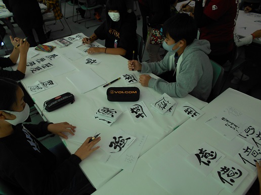 6年生の子ども達は、事前に決めておいた大切にしていきたい一文字(漢字)をていねいに書く姿が見られました。一人一人が味のある作品を作り上げることができました。西尾先生はじめ、9名の講師の先生方に感謝いたします。
