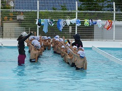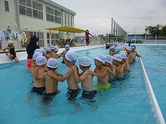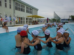 子どもたちは、男女別に電車をつくり、お互いの最後尾を先頭の子が捕まえるゲームをしました。大きな歓声と途中でぶつ切れになってしまう電車。水の抵抗で思うように進めない中の勝負でした。ゲーム中に「寒いよ~。」と子どもたち。曇り空のため、少々肌寒かったのですが、南小での初プールを楽しめたのではないでしょうか?
