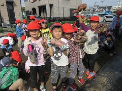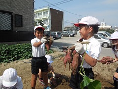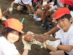軍手にスコップと、1年生の農作業の準備は万全!子どもたちはうねからサツマイモを掘り出し始めました。すると、出るわ出るわの巨大サツマイモ!楽しくなり、一生懸命掘る子どもたち。気がつけば、一生懸命すぎて、サツマイモの皮まで掘って?しまい、サツマイモがまだらになってしまいました♪たくさん掘れたサツマイモは廊下に並べられ、静かに調理されるのを待っています。