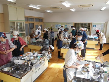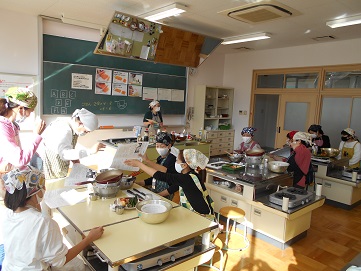 栄養教諭の増田先生を講師として迎え、かきまわしごはん・鮭のごまみそ焼き・きゅうりの香り漬け・かきたま汁・ほうじ茶のプリン作りを行いました。