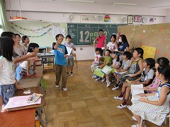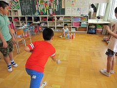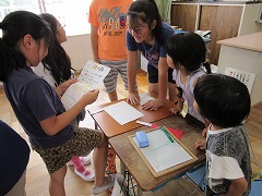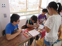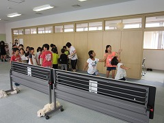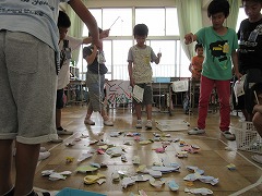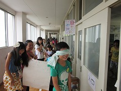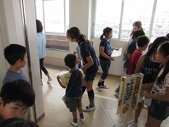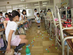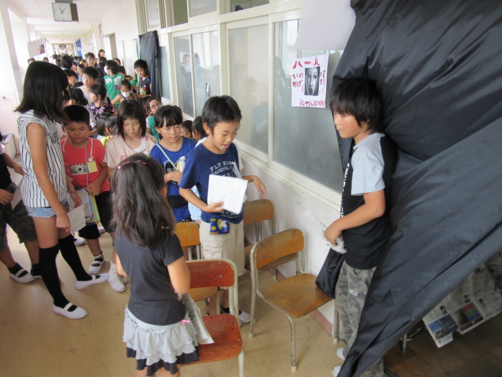 「◯年◯組みです!◇◇をやっています!来てください!!」呼び込みの大きな声が響く廊下を、南小の子どもたちが笑顔で歩いて行きます。まるで、夜のお祭りの出店を巡っているようです。教室からは、「はい、5点です。もう一回投げてください。」「タイマーの準備できた?」「ここで並んで座っていてください。・・・次、できる?じゃあ、どうぞ。」と、声が聞こえてきます。お店の担当者が、ていねいに説明したり、担当者同士で連絡を取り合ったりして大忙しです。お客の子たちは、ゲームを楽しむのはもちろん、合格のはんこを押してもらい、満足げに店を後にしました。2時間のお祭りは、本当にあっという間に過ぎていきました。