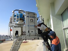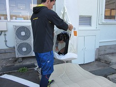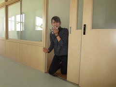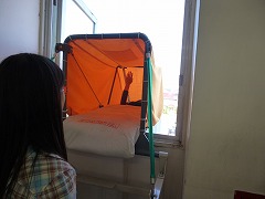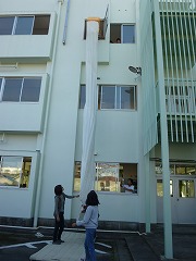 高学年は、3階から救助袋を使った避難体験をしました。屋内階段も、非常階段も使えない緊急事態にはこれの出番です。学校ではなく、大きな建物でも使われるかもしれません。垂直落下式なので、入り口のバーを離すのに、かなり勇気が必要でした。