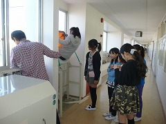 火元を避け、運動場への避難を終えると、学年ごとに防災体験をしました。低学年は、図工室に煙を満たし、煙の中の避難体験をしました。5人一列でまっすぐ歩くのですが、少し離れると前の子すら見えなくなるほどの視界でした。煙にむせながら、見ず知らずの暗い建物内を避難するかもしれないと説明を受けると、子どもたちは煙の恐ろしさを想像できたようでした。