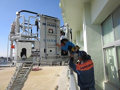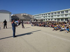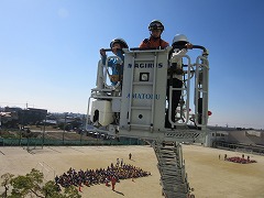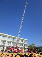 中学年は、はしご車による避難体験をしました。学級委員が、実際の避難用ベルトやヘルメットをつけ、3階から地上へ運んでもらいました。絶対に事故が起きないように、2つのフックを建物や救助かごに掛けたり外したりしながら避難するので、わずか2人を救助するのにすごく時間がかかります。地上では、順番を待つ間に火が広がることを想像し、「(はしご車に助けてもらわずないように)絶対早く避難しよ。」と考えた子もいました。