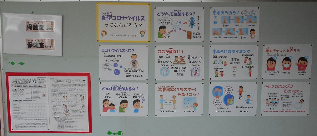 写真は保健室前の掲示板です。子どもたちに新型コロナウイルス感染症について理解してもらうため、養護教諭が作成しました。正しく新型コロナウイルス感染症を理解してもらうことで、感染症に起因する、いじめや偏見をなくしていくことも大切になってきます。