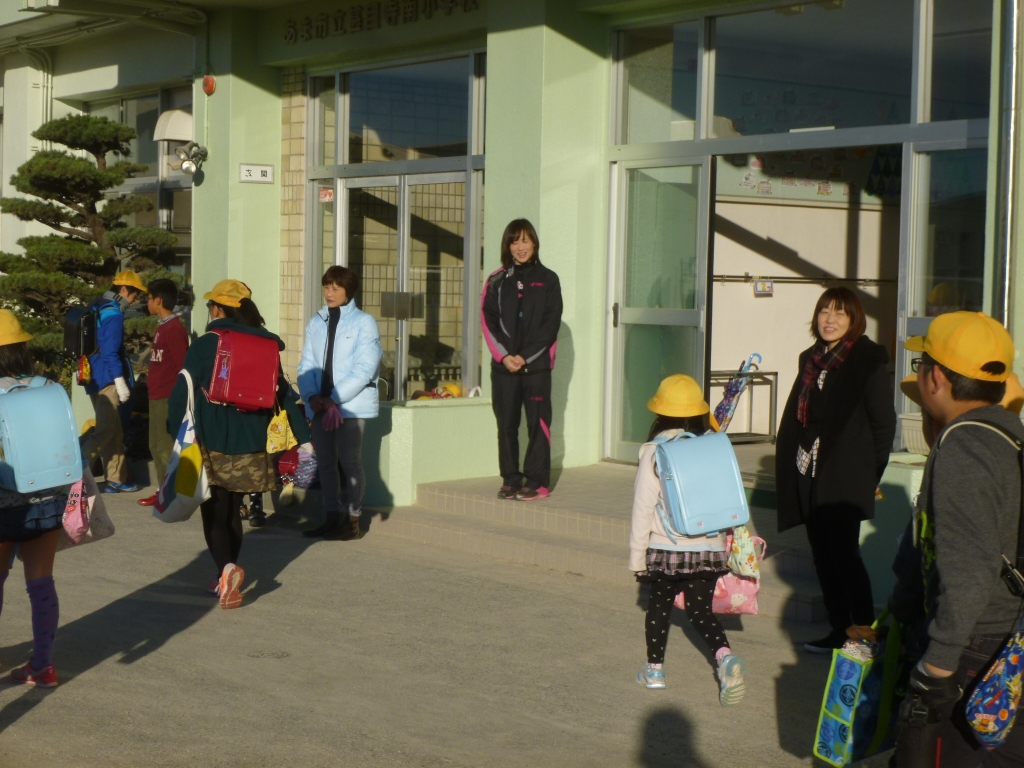 今朝は、PTAのお父さん、お母さん方によるあいさつ運動です。朝早くから学校にお越しいただき、門や昇降口であいさつを行っていただきました。