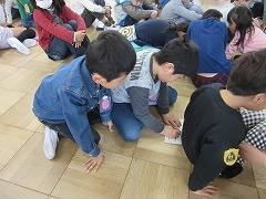 通学団会では、新メンバーの名簿を作ったり、1年生のお世話係を確かめたりしました。また、1年生が、同じ班の仲間に改めてあいさつをする機会も設けられました。また、この日は先生たちと一緒に登校したので、登下校の様子や危険箇所を確かめることができました。新リーダーが中心となって会を進め、スムーズな通学団会になりました。