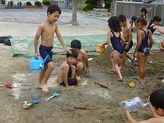1時間目。水道で水をくみ、砂の山を作ったり、左右から穴を掘ってつなげ、トンネルを作ったり、湿らせた砂でお団子を作ったりと、思い思いの遊びを楽しむ1組の子どもたち。いつしか砂場に池ができ、数人がそこに座って行水を始めていました。泥が体に着いても大丈夫 ♪ 2時間目は体育でプールに行くのですから。普段はできない、ダイナミックな遊びができました。