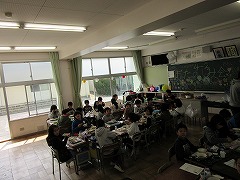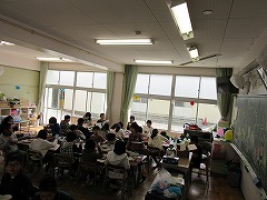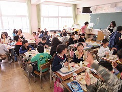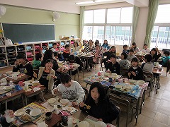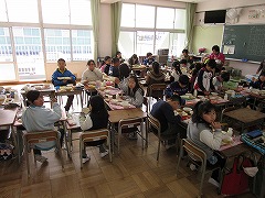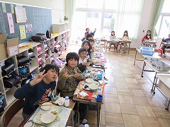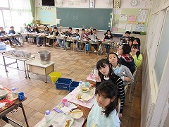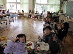 4-1では、お楽しみ会で作った輪の形をそのまま給食の形にしました。たくさんの友達の顔を見て食べる給食は、いつもとちょっと違う雰囲気でした。