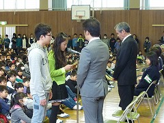読み聞かせボランティアの皆さん、農園や図書室の本でお世話になっている桑山さん、登下校を見守っていただく地域ボランティアの皆さん、栄養士さんや調理員さん、交通指導員さん、河村産業所さん、PTA会長さんをお迎えし、日々お世話になっている感謝の気持ちを伝えました。また、全校合唱を聴いていただいたり、プレゼントを手渡したりしました。1年間ありがとうございました。また、28年度もよろしくお願いします。