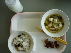 29日の給食は、ひじきご飯、麩のすまし汁、マグロの味噌がらめでした。