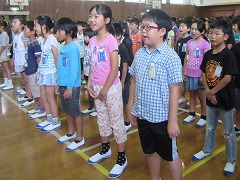 今日は、朝礼の前に集会委員会の『歌声集会』がありました。教室には『レッツゴー!あしたへ』の歌詞が掲示され、音楽の時間や給食の後などに歌っています。それを初めて全校で歌いました。