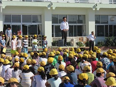 雲一つない快晴の空の下で、今日の朝礼は行われました。夏休み中前から行われていた学校の工事が終わりに近づき、南側の足場が外され、美しく塗り直された姿が見られるようになりました。