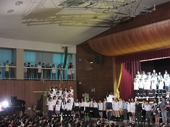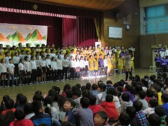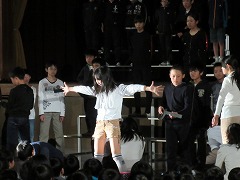 最後は6年生の『ぞう列車がやってきた』です。舞台の上や二階を合唱の舞台にする演出、豊かな声と動作で見せる演技、男子と女子の声が響き合う合唱など、どれをとっても最高学年らしいすばらしい劇でした。