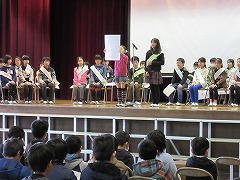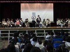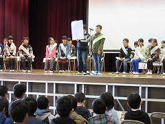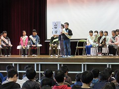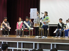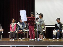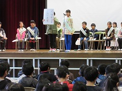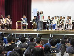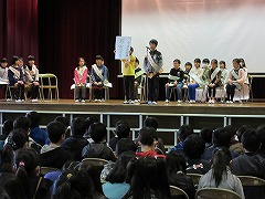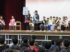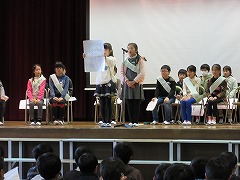 8日の1時間目に、来年度の前期児童会役員を決める選挙が行われました。3~5年生が卒業式の練習に使うパイプ椅子に座り、いつもと違う雰囲気の中での選挙になりました。