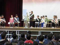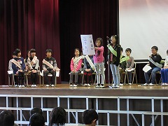 会長、6年副会長、6年書記、5年副会長、5年書記の順で立候補者が演説をしました。あいさつについて自分の思いを語る子、意見ボックスを作りたいと言った子、なかよし活動の充実を目指す子、みんなが気持ちよく過ごすことができる学校にしたいと言った子、募金活動を行いたいと伝えた子など、それぞれが大切にしたい点をしっかり伝えることができました。どの子もしっかりと語りかけることができており、誰に任せても児童会を盛り上げてくれそうでした。