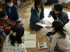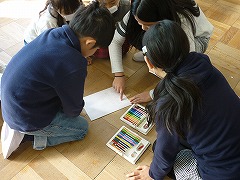 最初に5年生リーダーが説明をしました。前回の反省を生かし、とてもスムーズな説明でした。予習(進行表の読み込み)もばっちりのようですね。まず、各自が持ち寄ったメッセージを台紙に貼り、次に飾り付けをしました。かわいい絵を描いたり、表紙に色を塗ったりと、みんな一生懸命でした。「男子にはどんな絵がいいのかなあ?」「3匹のクマは色を変えた方がいいんじゃない?」「バラってどう描くの?」など、もらったリーダーに少しでも喜んでもらえるように考えることができました。