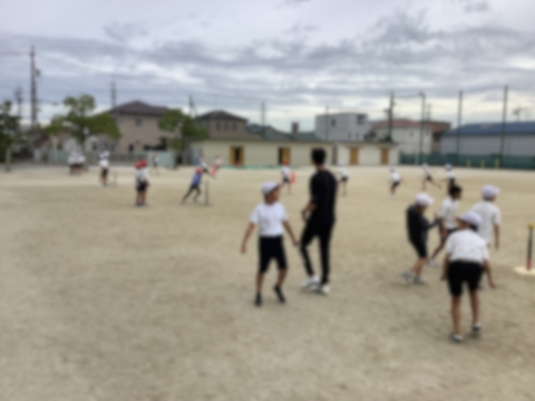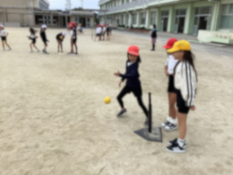 4年生の体育では、ベースボール型のゲームをしています。手でボールを打つ前に、仲間とどこを狙うか話し合っていました。また、みんなで協力して守備をしていて、楽しく活動していました。